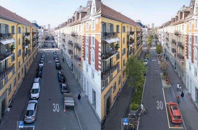 A post claimed that a study suggests that, on average, each shared car replaces 21 privately owned vehicles in Zürich. The post is accompanied by an image of a street in Switzerland's largest city filled with cars next to another image of the same street with more gardens and sidewalks because fewer cars are on the road.
