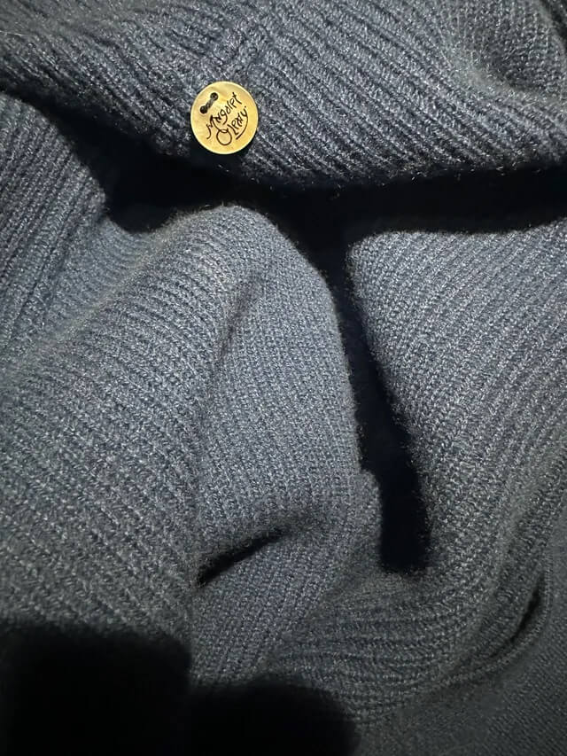 The accompanying photo shows off the lush navy blue cashmere, adorned by a single visible button embroidered with the piece's name that allowed the Redditor to look up the steep original manufacturer's suggested retail price.
