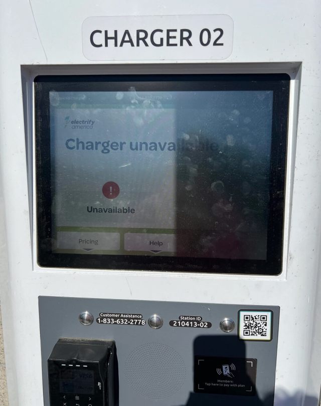In their post they shared pictures showing a three-charger Electrify America station with missing cables and a "Charger unavailable" message on the monitor. They asked the community "Who does this?"