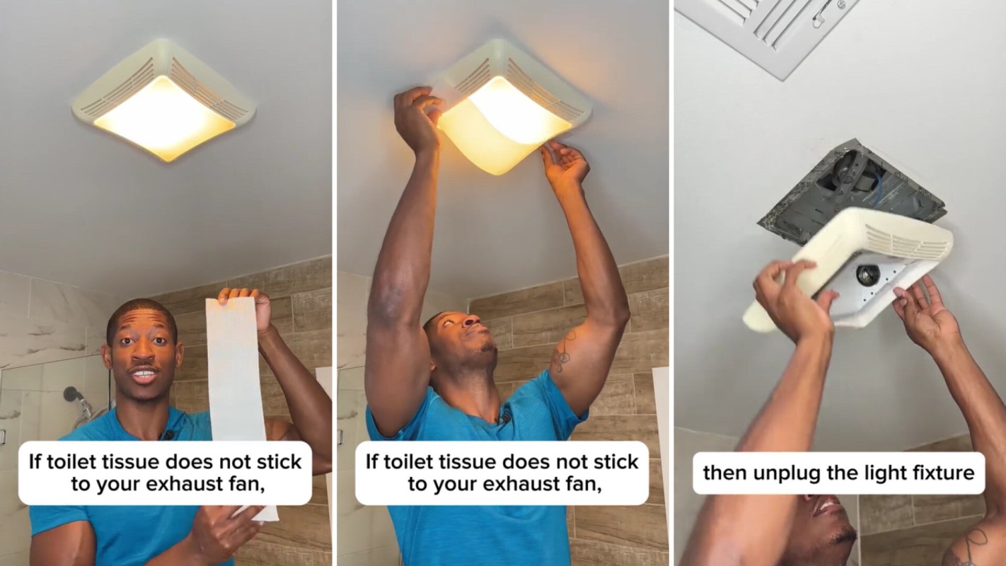 The video starts with a test to see if your fan should be cleaned. "If toilet tissue does not stick to your exhaust fan, it's time to clean or get it serviced," Kyshawn explains. He goes on to discuss how these fans are important for keeping your bathroom free of mold and mildew.