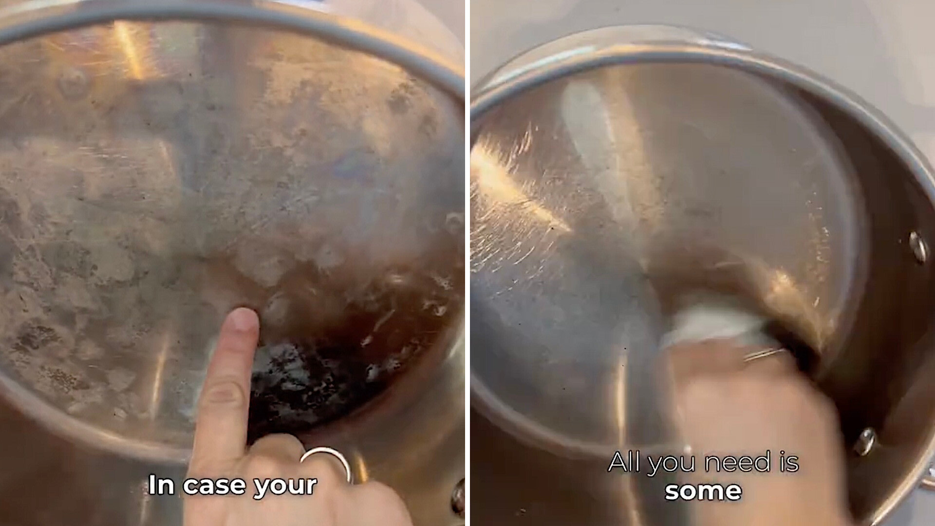 In the nine-second video, Dani (@danimade) explains how it's not necessary to buy "anything expensive, fancy, or harsh to clean your stainless steel pans," showing a pan with discoloration and stains that mar its shiny look.