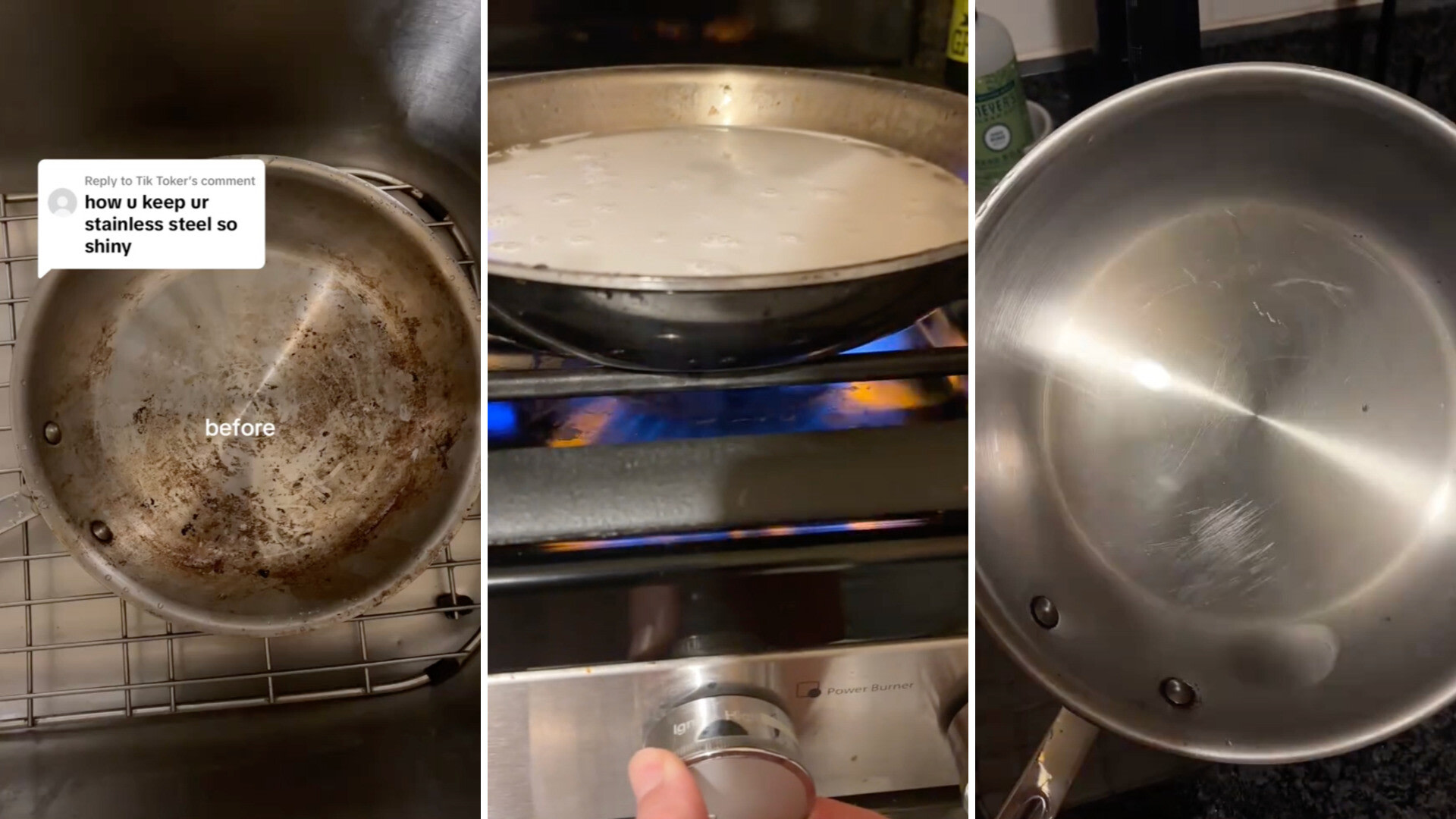 TikTok influencer plantbasedbaby (@plantbased.baby) shared a helpful hack for removing stuck-on residue and stains from stainless steel pans, and followers were enthusiastic about the great tip.