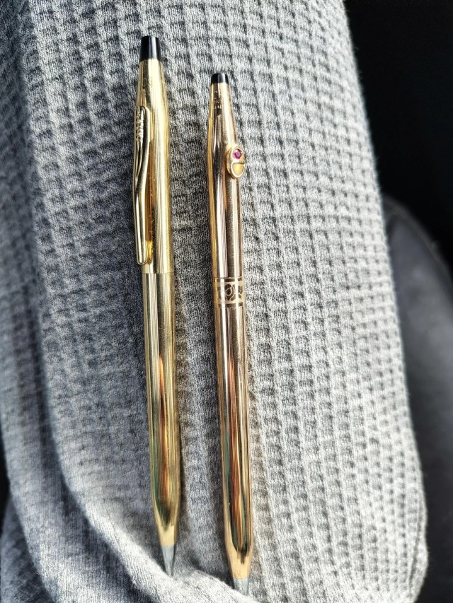 "Found a cute set of pens at local thrift store, upon closer inspection they are 14k and 12k gold respectively and one has a real ruby in it," wrote the original poster. "It also came with the original leather case!"