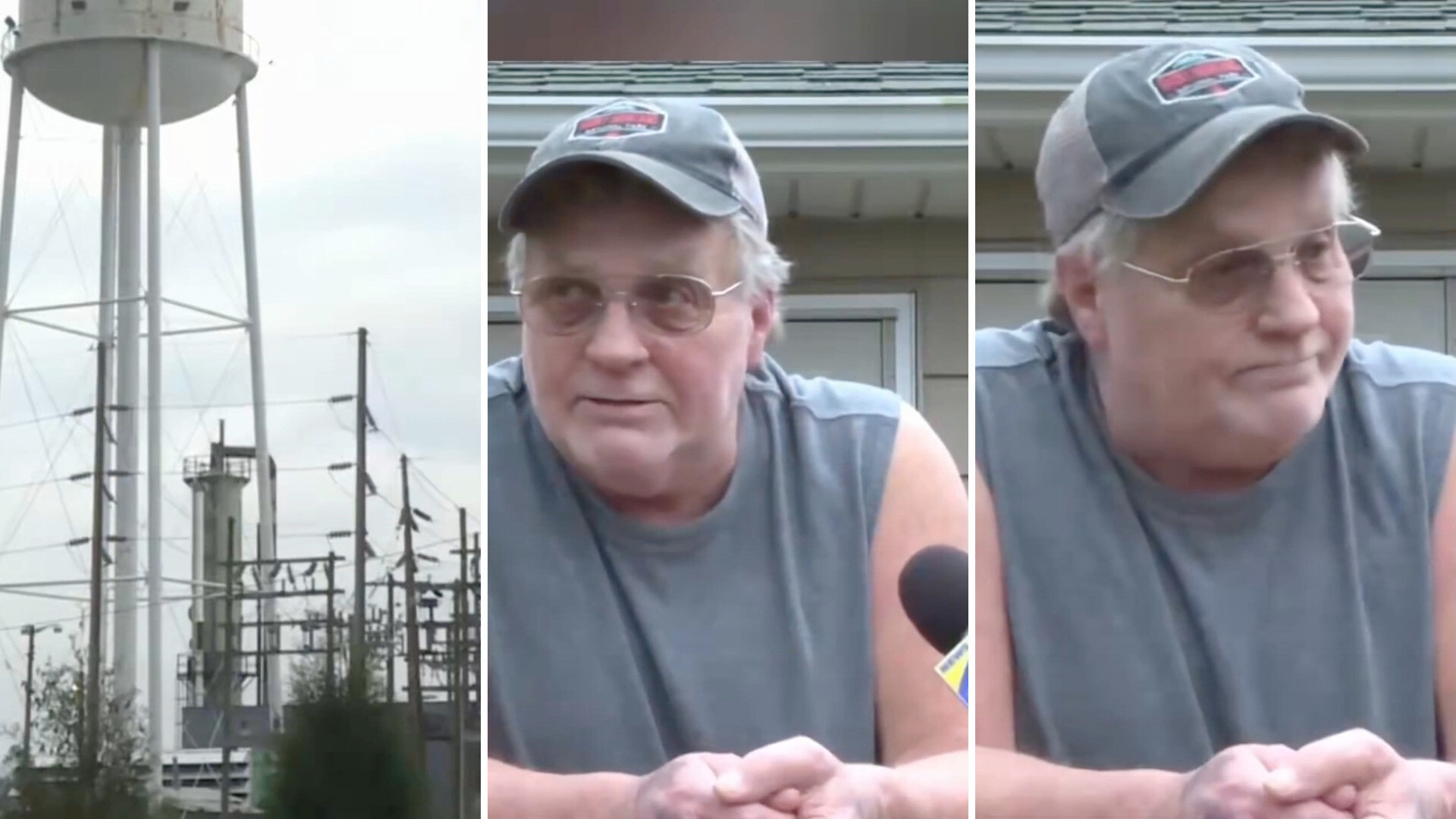 A man in a sleeveless shirt speaks in front of a water tower and power lines by a data center.