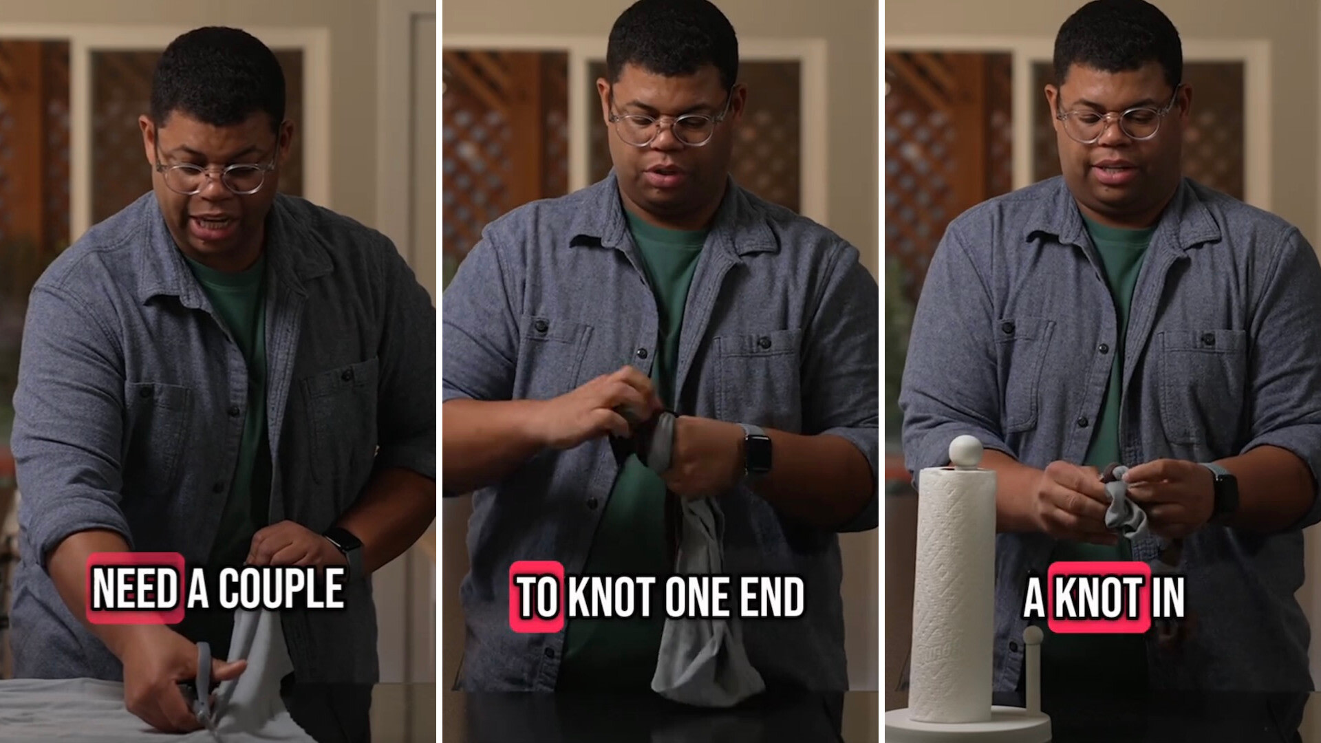 At one end, tie three pieces of fabric into a knot. Then the TikToker demonstrates how to braid them, ensuring each section is tight. Leave some unbraided fabric at the end so you can tie it into a second knot. You can trim each end to clean it up, if desired.