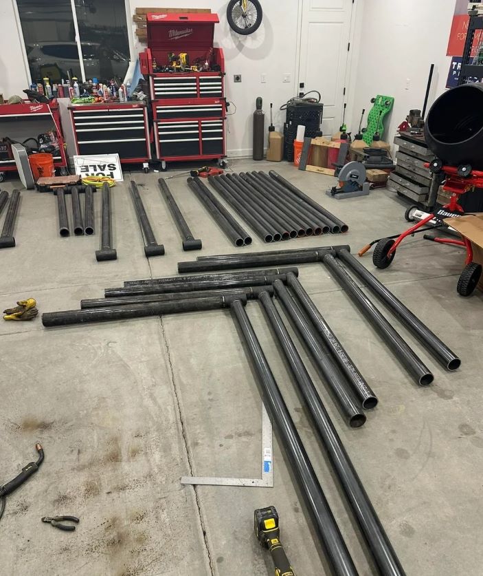 Their first few photos show the cleared ground and the digger used to clear it, as well as the large-gauge pipes they used to build the racking system.