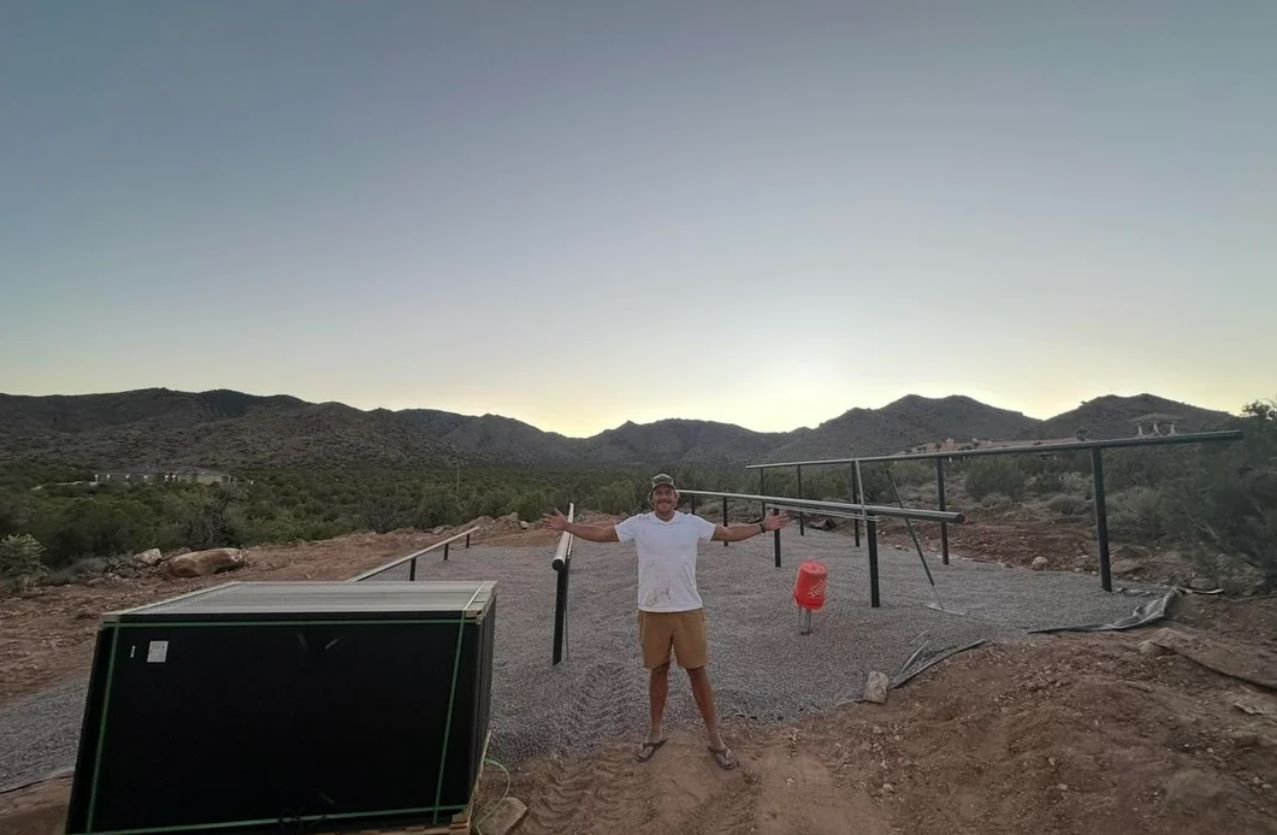 After assembling it with a forklift and lifting it into place with a crane, the original poster topped the structure with 60 solar panels.