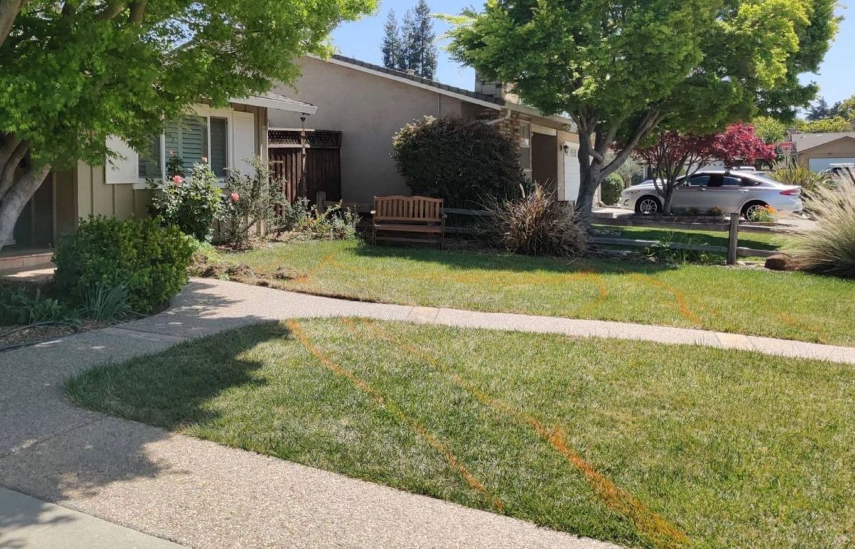 In the post, the user shared a "before" photo of an ordinary lawn with a concrete path running through it. Another diagonal path was outlined in spray paint, but the hard work of removing the grass was yet to begin.