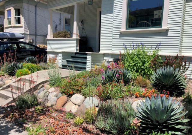 On another photo, they added, "This side has yarrow, perennial buckwheat (erigonum - a personal fav), succulents, agaves (ouchies), aloes, lantana, nepeta, sage, and some small leucadendron at the back." The flowers are dotted with succulents and divided by a row of river stones, all of which lend variety and a natural but cultivated feel.