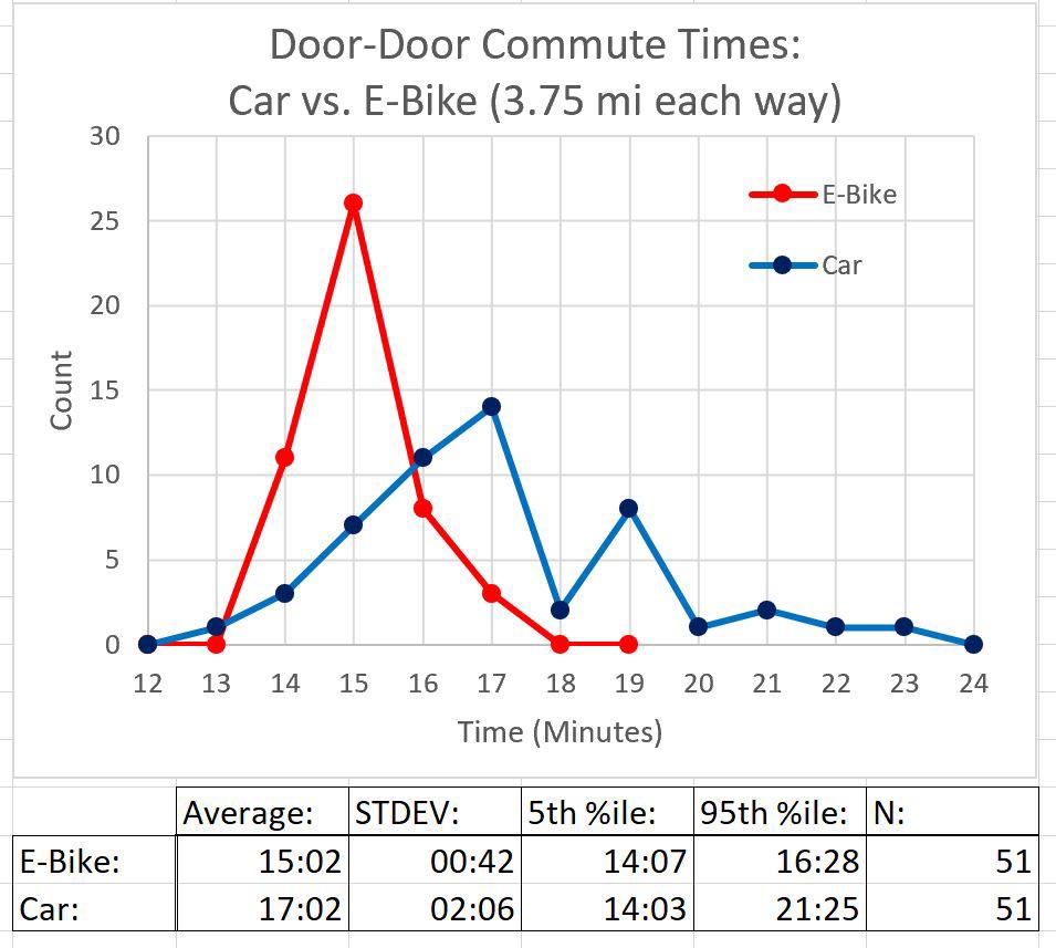 Writing in a subreddit about e-bikes, a user posted almost two months' worth of data they collected on their daily commutes. The conclusion? On average, riding their e-bike to work was about two minutes faster than driving a car. "Here are the numbers," they wrote in the post's title.