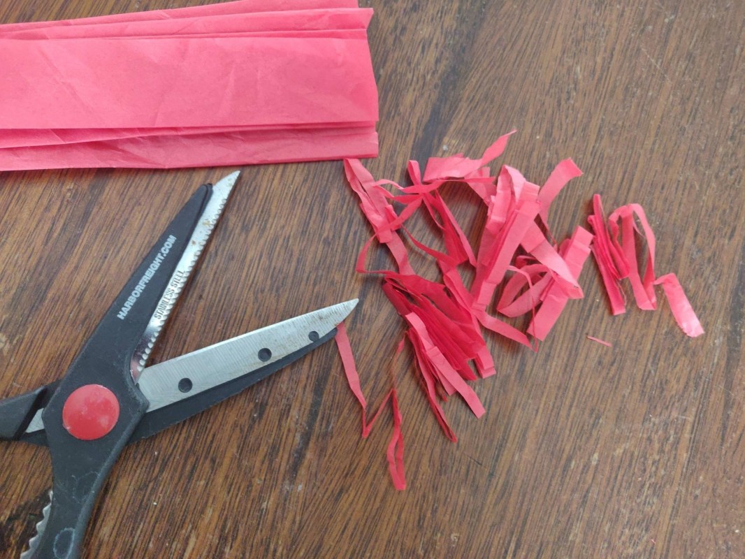 In the post, the Reddit user shares a photo of tissue paper used for stuffing in gift bags, snipped up into strips.