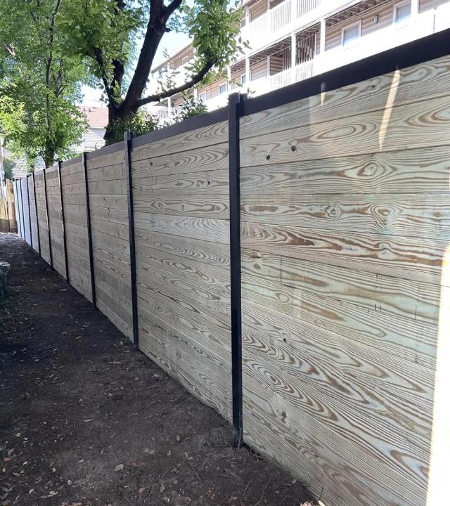 The fence features light gray wood with black edging and looks incredibly well-built.