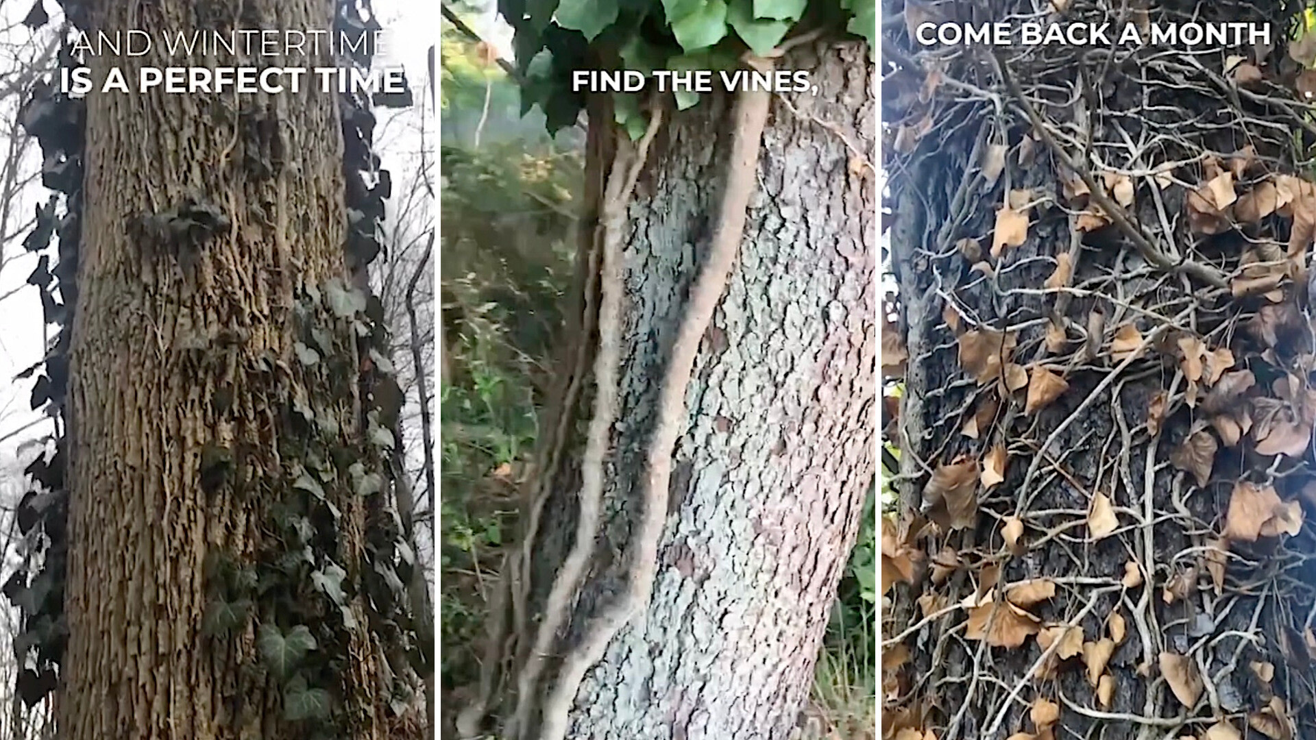 The TikTok shows viewers how to use a pair of pruning shears to cut a 6-inch section from each vine, perhaps a foot or so from the ground. This cuts the entire length of ivy from its primary nutrient source below and inhibits its ability to produce more seeds.