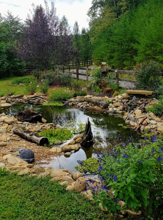 In addition to the rocks and logs, the homeowner planted an array of native plants, including blue salvia. The pond attracts lots of different wildlife, such as frogs, turkeys, and opossums. The OP explained that several of the plants surrounding the pond, including bee balm, milkweed, and hummingbird mint, were planted to support pollinators.