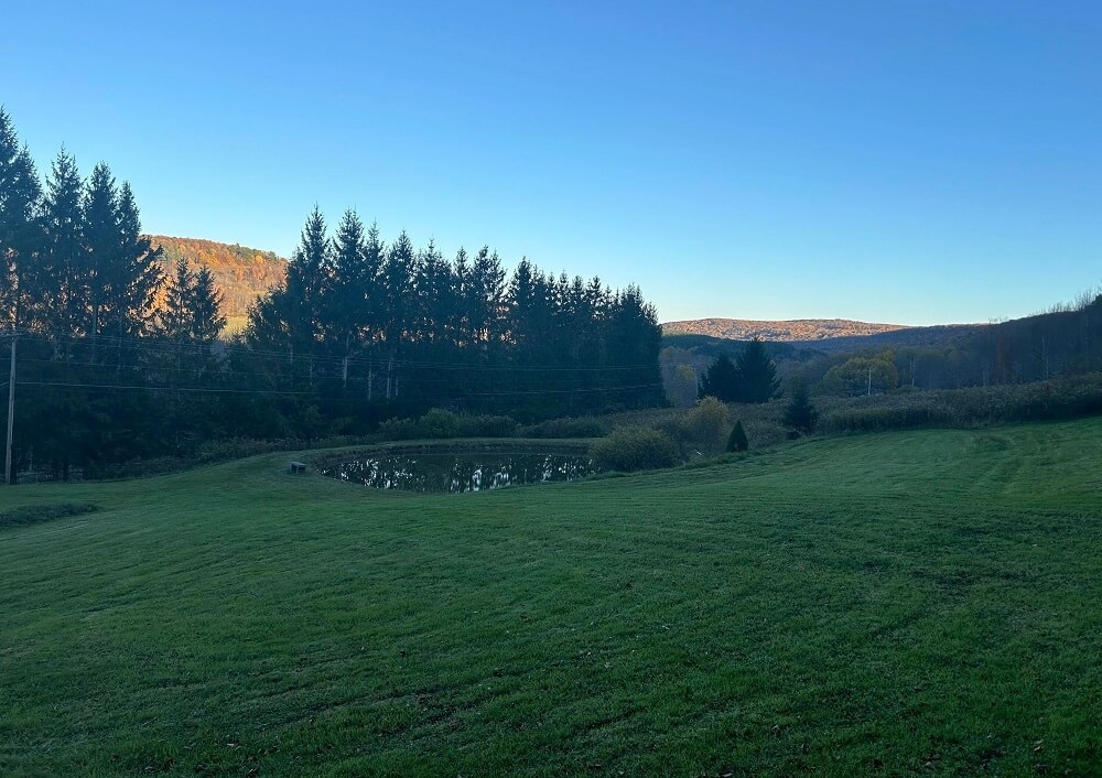 The photos show that the property in upstate New York has a large, uneven yard with a big pond and is bordered by a thick forest that ends abruptly at the property line. The homeowner said that they wanted some ideas for what to do with the space to reduce maintenance, writing, "I have a disdain for mowing. It makes it worse that our property is extremely bumpy, so I have to mow on our tractor extremely slow."
