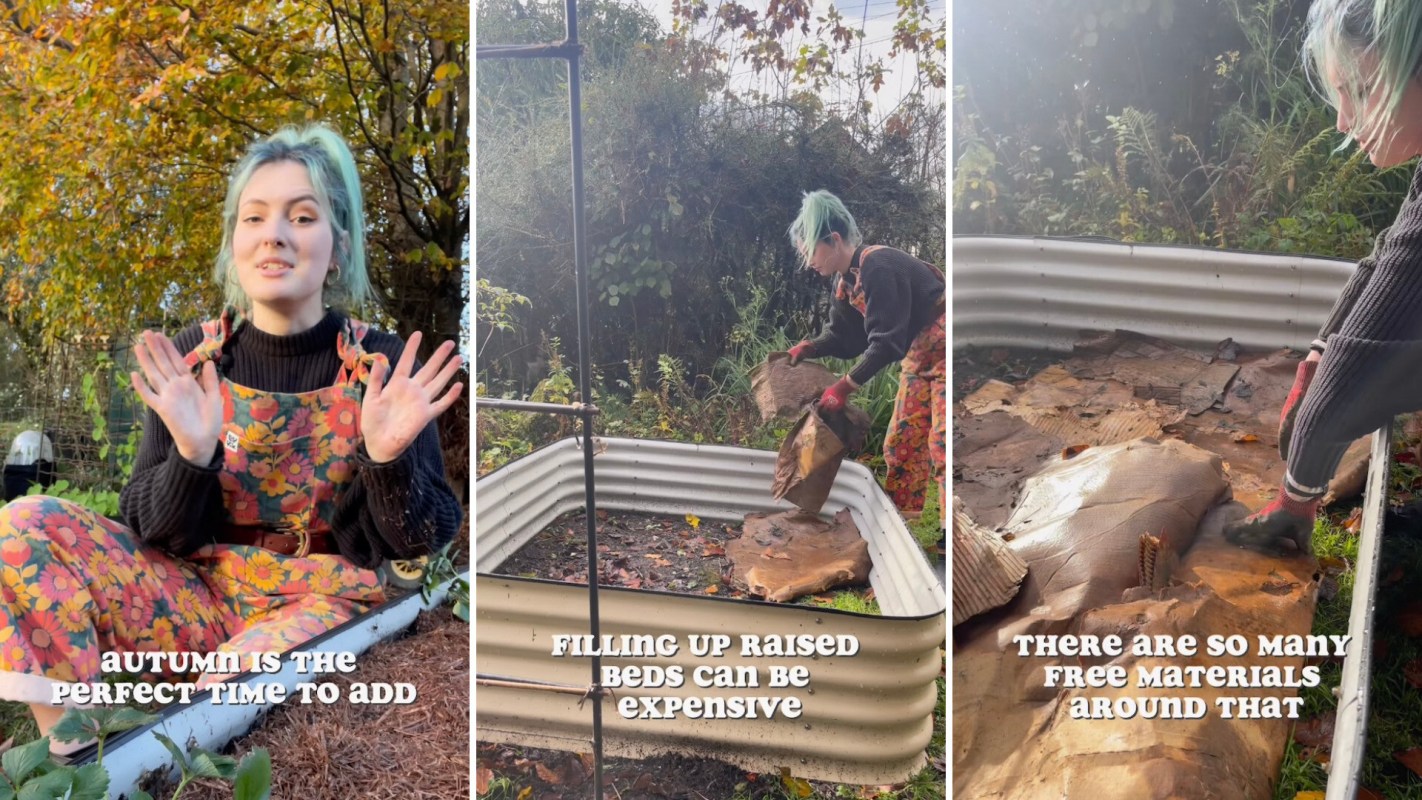 She explains that there are "so many free materials you can use" in autumn to fill up your raised beds cheaply with stuff that plants will love. She starts one to demonstrate, adding cardboard, sticks, leaves, and dirty bedding from her ducks.