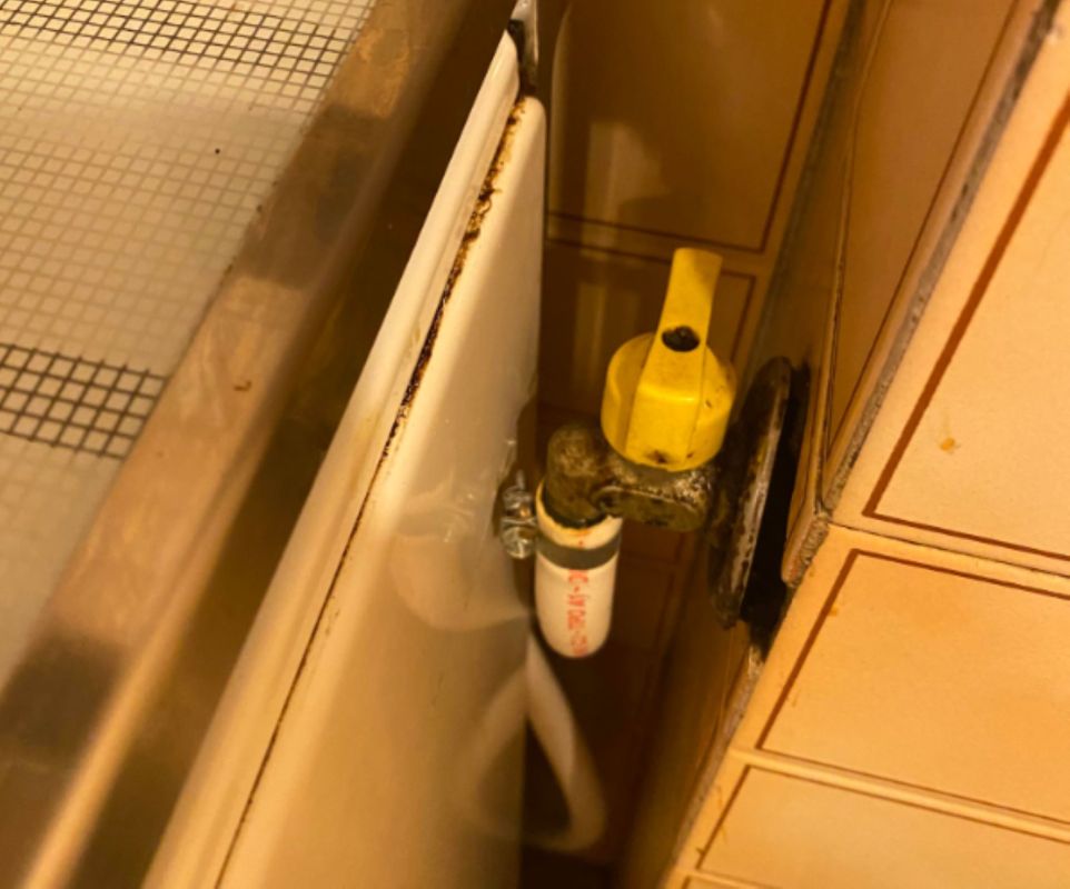 Upon closer inspection, the photo revealed the line to the gas stove was wrapped with a PVC pipe and what looks like duct tape and a hose clamp.