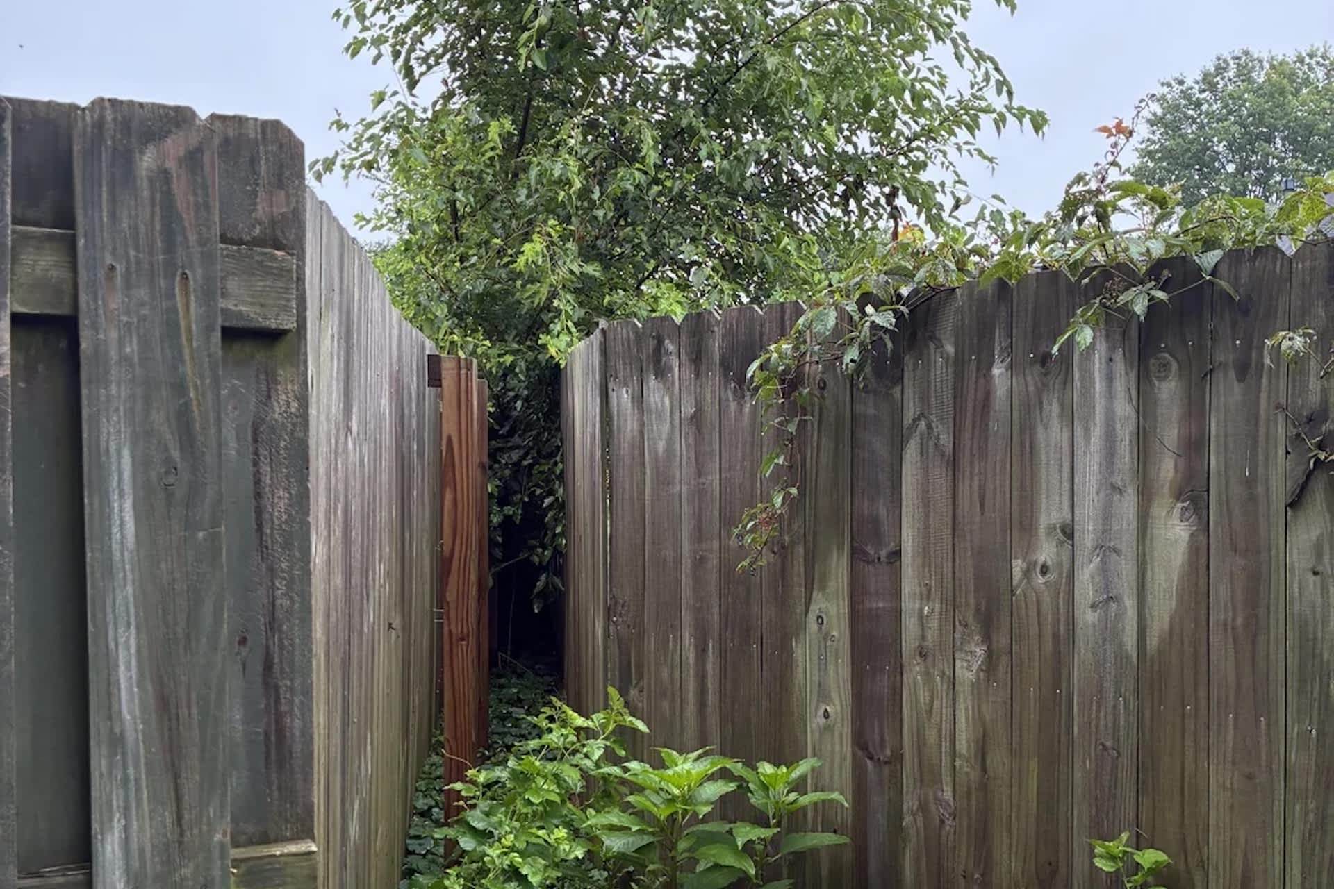 On the r/treelaw subreddit, the original poster shared a picture of a small space between two wooden fences overgrown with weeds.
