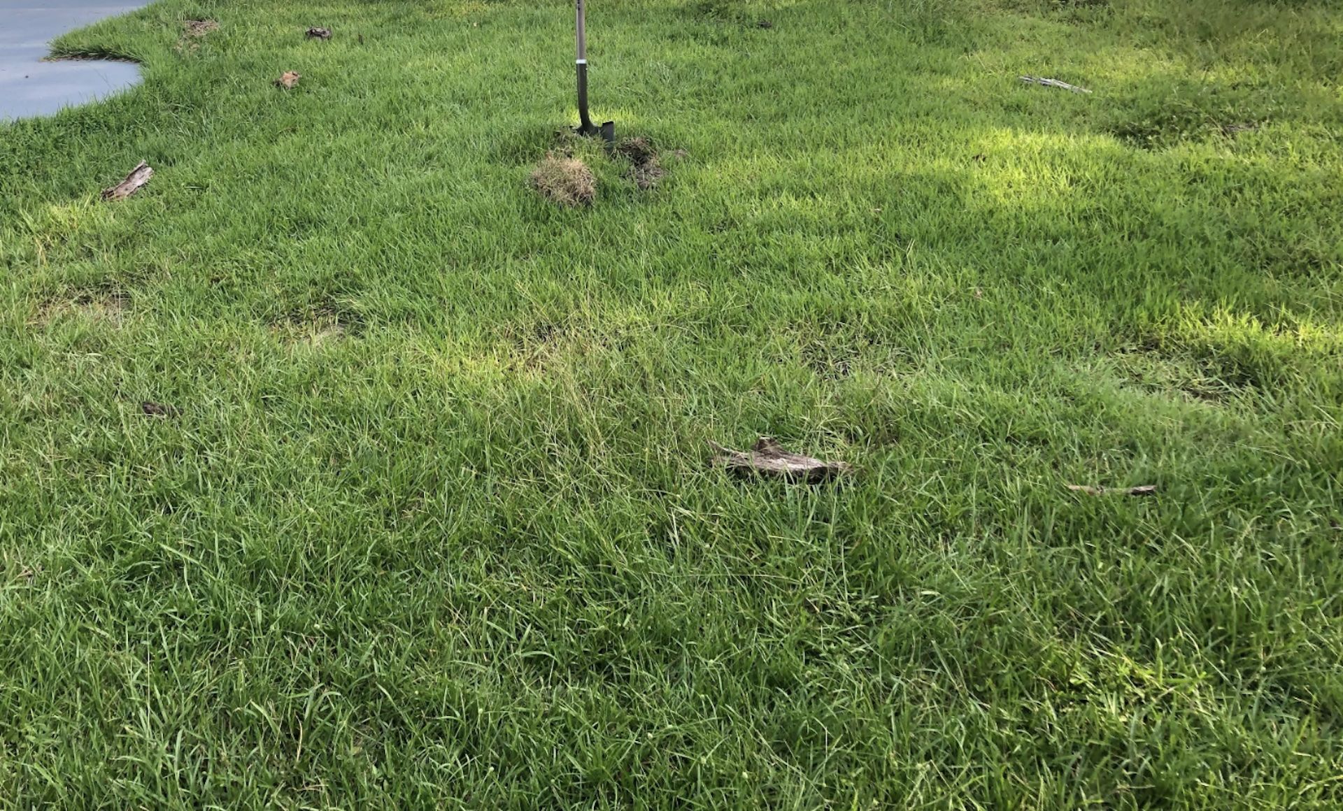 They created a bean-shaped plot surrounded by a raised berm, and within was some newly planted grasses and shrubs, as well as a layer of mulch.