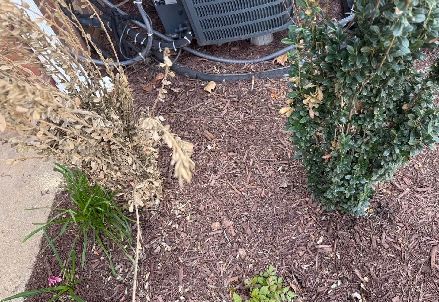 "HOA made us get rid of flowers, only allowed to keep these unknown plants," wrote the original poster. The photo showcases a barren garden with sporadically placed shrubbery.