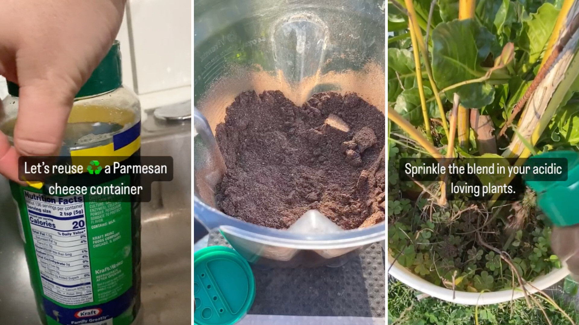 To try the hack, Eterna says to find an old shaker in your home and take off the label. Then, blend eggshells and coffee grounds in a blender and add to the shaker. From there, pour on all your acidic-loving plants and watch them thrive.