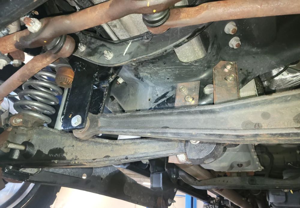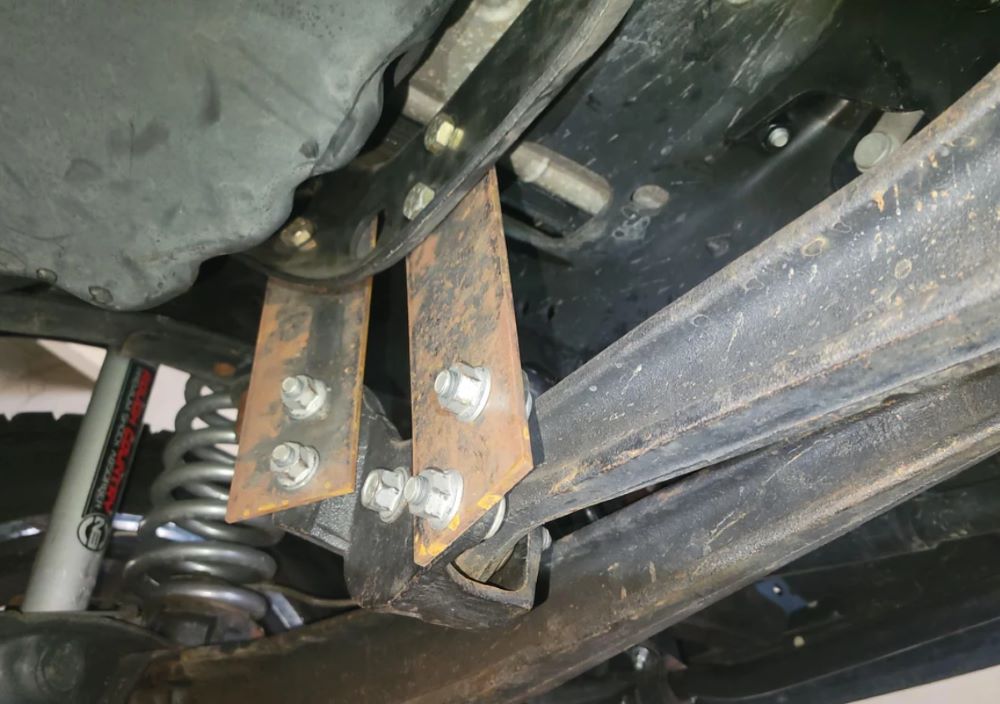 Rusted metal brackets appear to be bolted straight to the vehicle's frame and suspension components. The makeshift pieces show signs of corrosion and uneven installation.