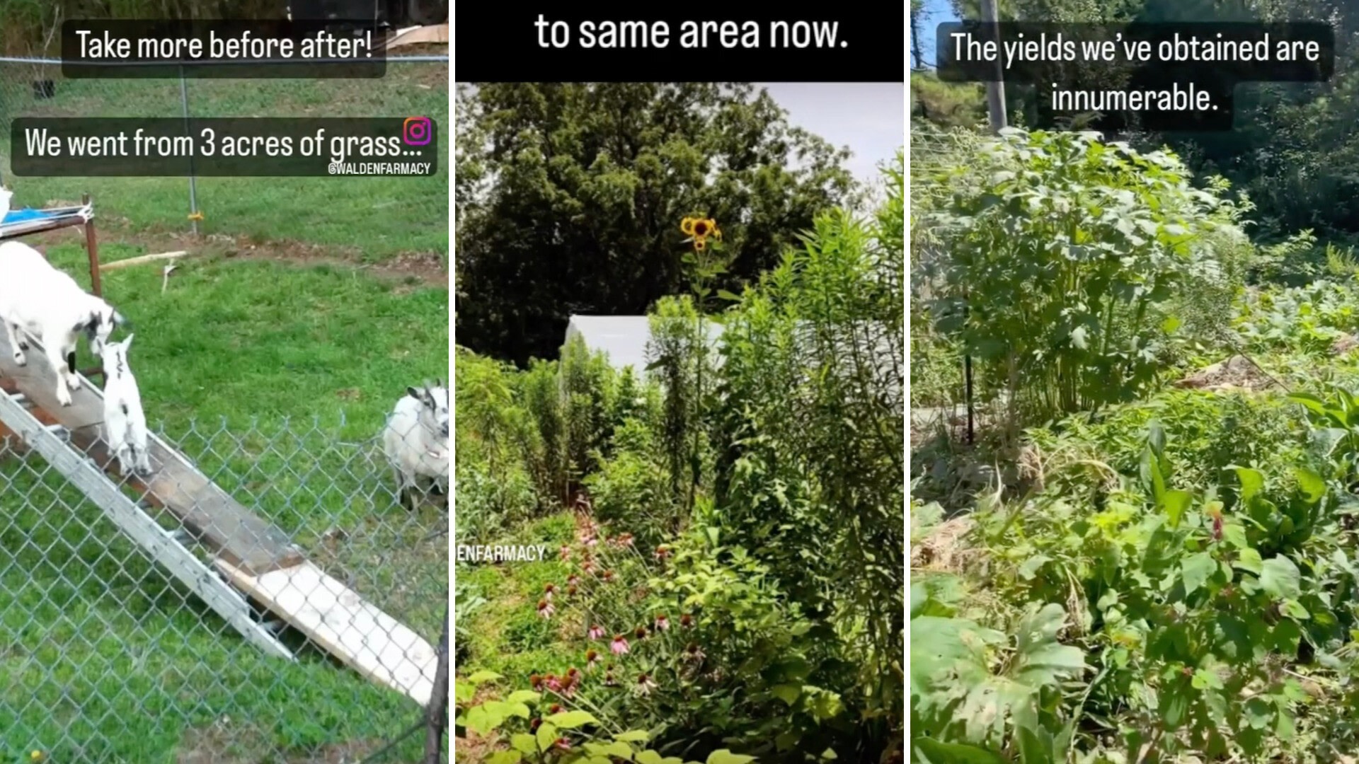 The images show different areas of the property, which started out as three acres of grass and is "now providing our food and medicine," per Walden Farmacy. According to the video captions, the property went from bare earth to plants taller than a person, from grass to beautiful mulch beds full of useful plants, and from a hand-turned compost pile to "one where chickens do the work."