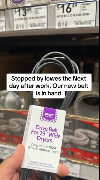 The next day, he picks up a replacement belt from Lowe's for just $13.67 and gets to work. In the final frame, the drum is spinning again, the belt is snugly in place, and the repair is complete.