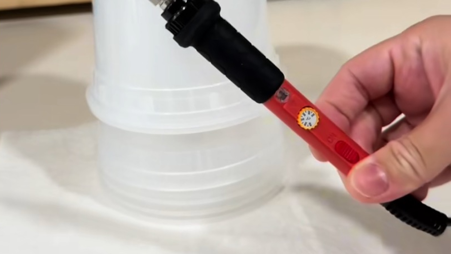 After washing the containers thoroughly, she carefully uses a soldering iron to make drainage holes in the bottom. These holes are important because they prevent water from pooling, which helps keep plant roots healthy.