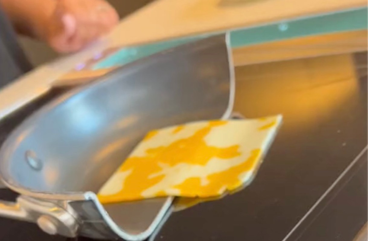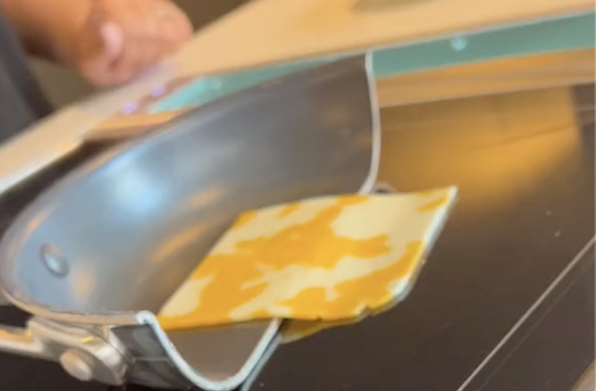 Chantelle Hope (@chanthope) posted a video of a pan cut in half. A slice of cheese is placed half on the pan and half on an induction stovetop.