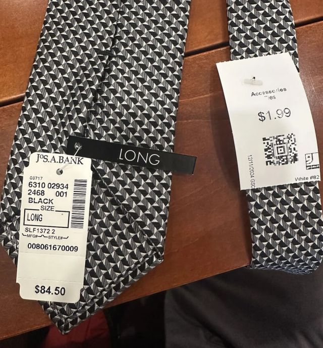 The thrifter shared an image of a Jos. A. Bank tie with the price tag still on it in the r/ThriftStoreHauls subreddit. The original price was $84.50, and Goodwill was selling it for $1.99.