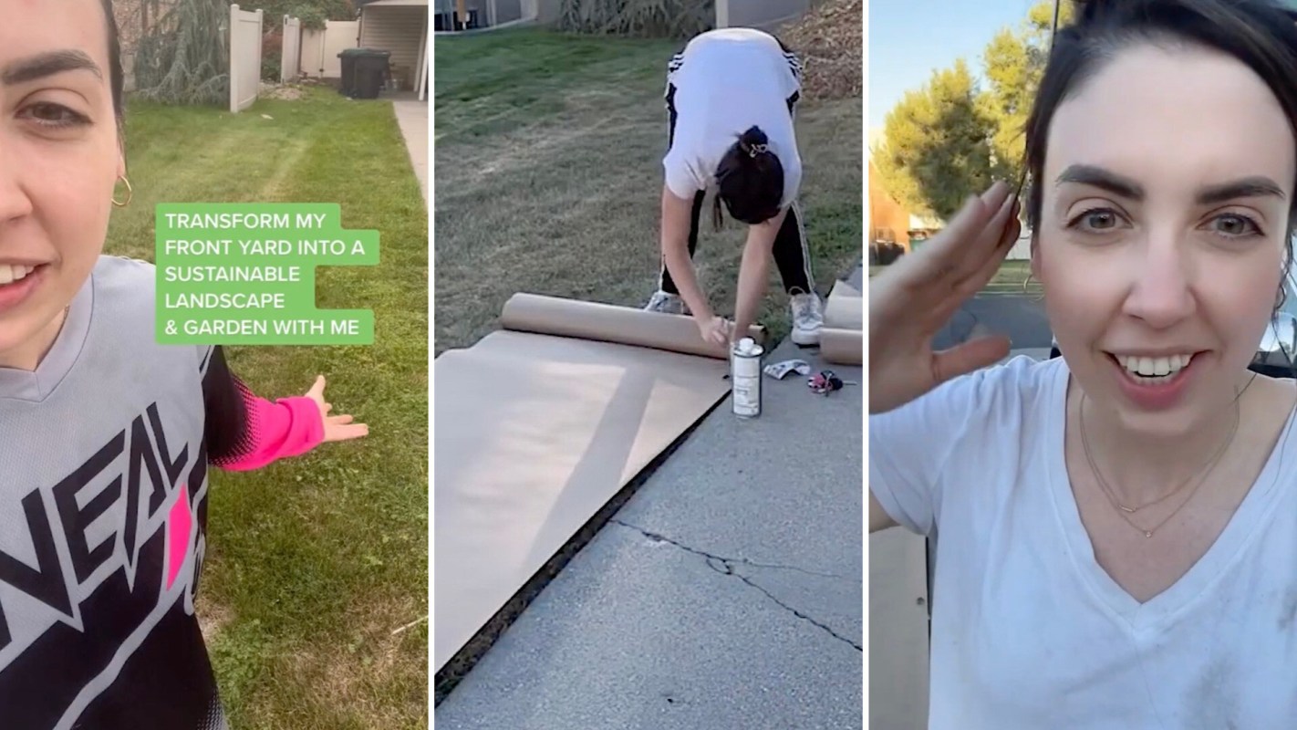 To start, Lindsey begins by laying out rolls of contractor paper, which she explains she plans to cover with mulch to smother the existing grass.