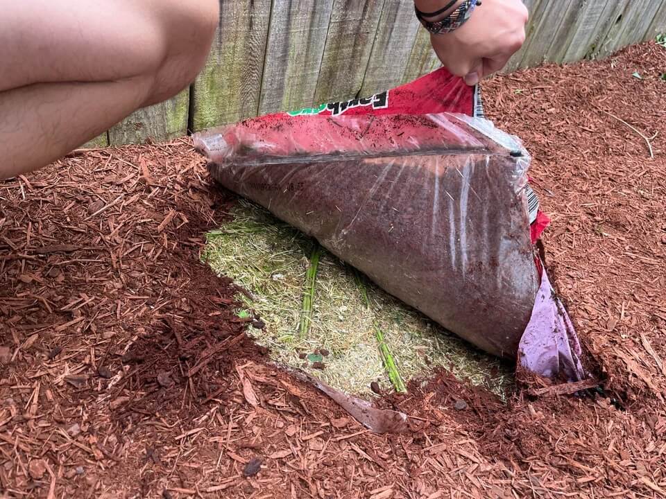 The rest of the pictured area is covered in unbagged mulch, and the bag is held up by the corner, revealing a patch of dying grass underneath.