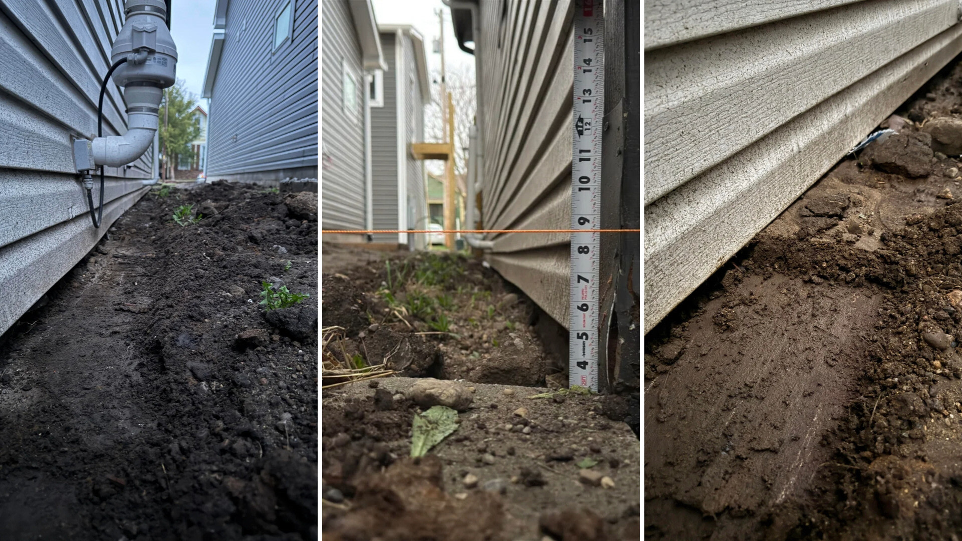 The attached photo shows a narrow strip of exposed soil, squeezed tightly between two homes, with the siding already showing signs of water stains.