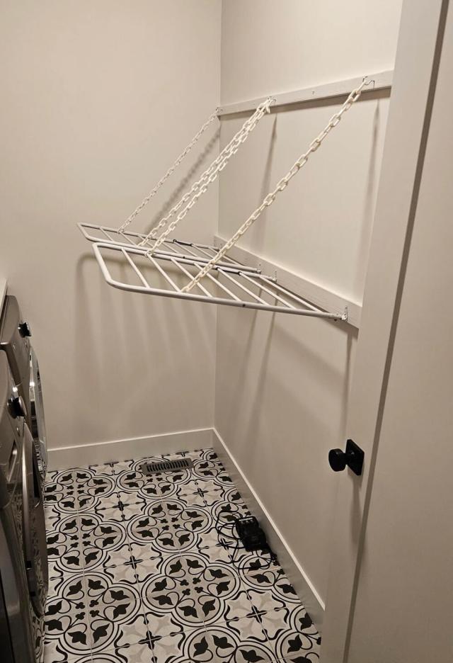 In the r/DIY subreddit, the homeowner shared how they maximized the space in their long, narrow laundry room by repurposing an old clothes drying rack.