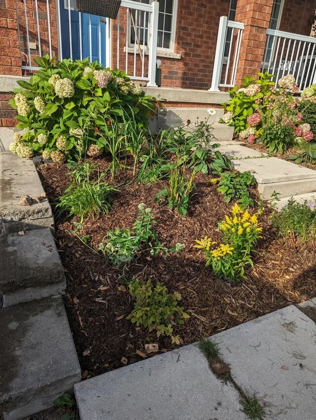 The "after" photo showed a charming mulch bed with several new varieties of plants, including flowers like foxglove and goldenrod. Although they were still young, some had already begun to bloom.