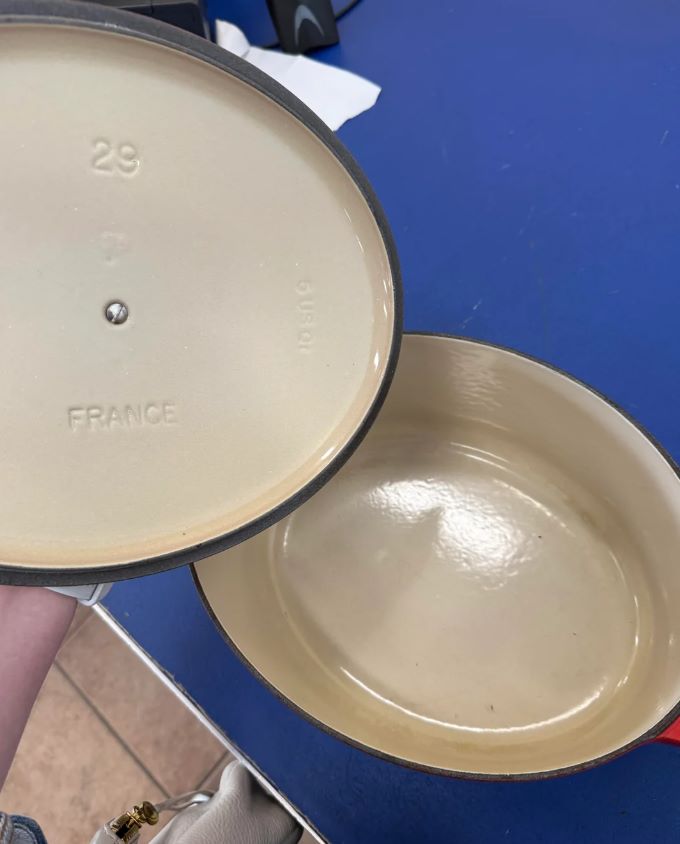 A savvy shopper struck gold at their local thrift store. Shared to r/ThriftStoreHauls, the OP's pics of their (almost) new fiery red Le Creuset Dutch oven had commenters bursting with pride — and a little envy.