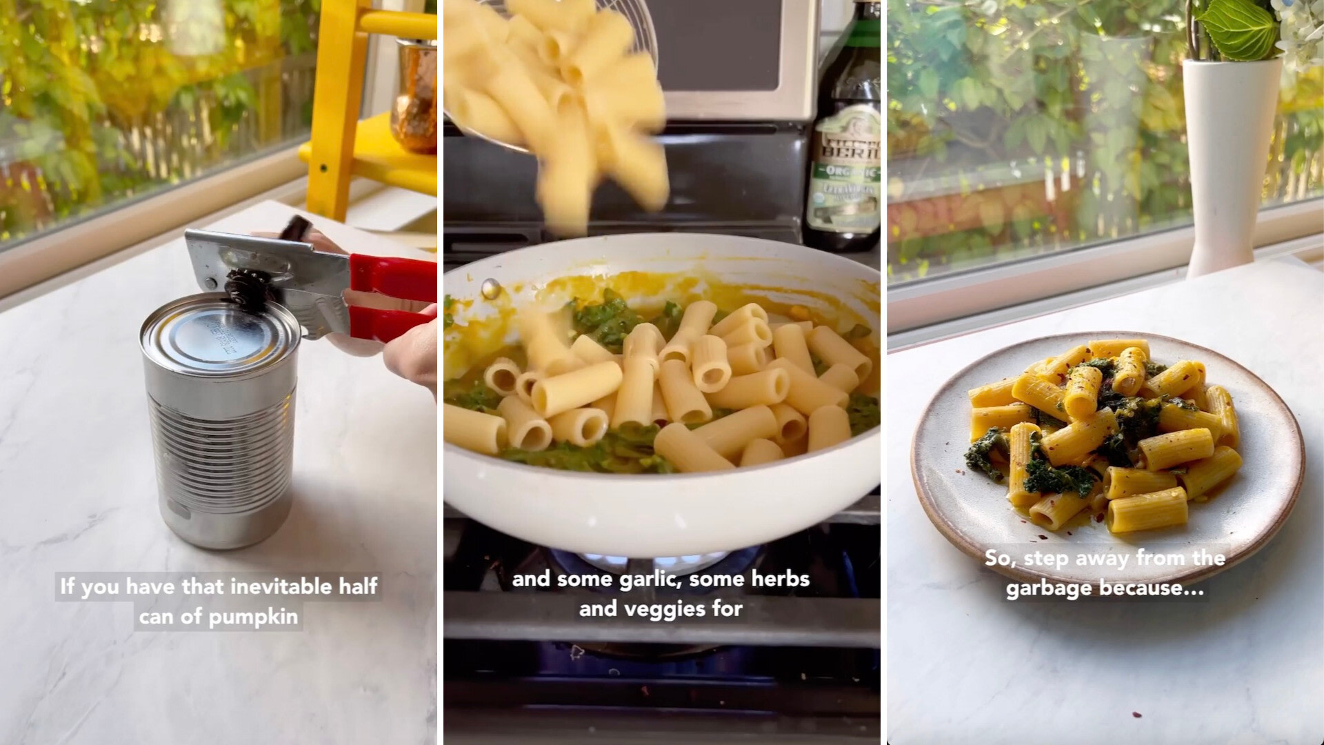The post not only shows an easy way to save food that would otherwise be wasted but also includes a recipe for garlicky pumpkin kale pasta, proving that the puree is good for a lot more than pie.