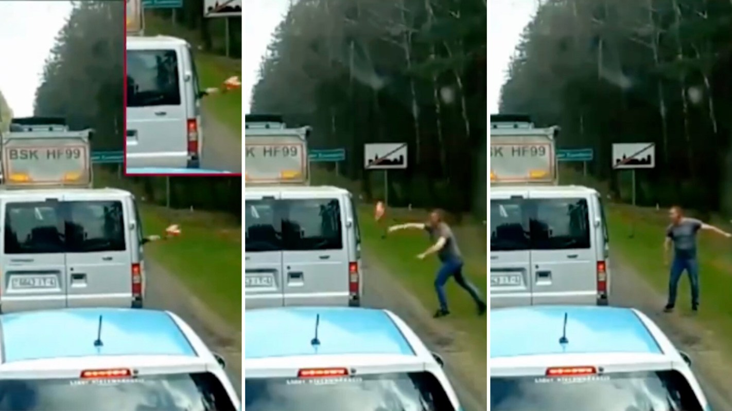 In the clip, several boxes fly out of a van that is idling in traffic. Mere seconds pass before a truck driver exits his truck, picks up one of the boxes, and tosses it back into the van. After a brief, intense conversation — in which no sound can be heard in the video — a person gets out of the van and picks up the remainder of their litter.
