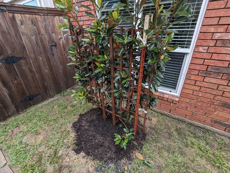 In the post, the OP shared a picture of their freshly planted magnolia tree growing up a trellis and reached out to ask, "Is this a mulch volcano or acceptable?"