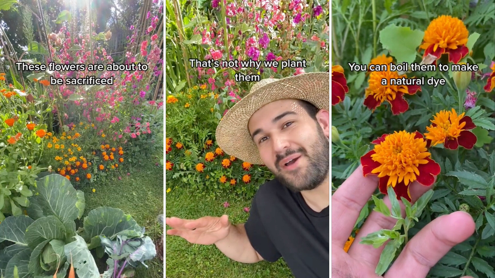 In a viral post, TikToker Joe's Garden (@joesgarden) walks through his garden to show off his pest management trick: planting marigolds near high-value crops to lure pests away.