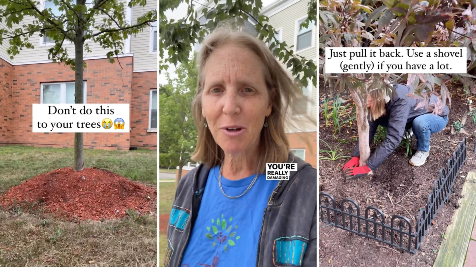 "Have it just be flat to the ground," Jess says in the video. She shows how to dig up a mulch volcano to expose the root flare, where the main roots "flare" outward.
