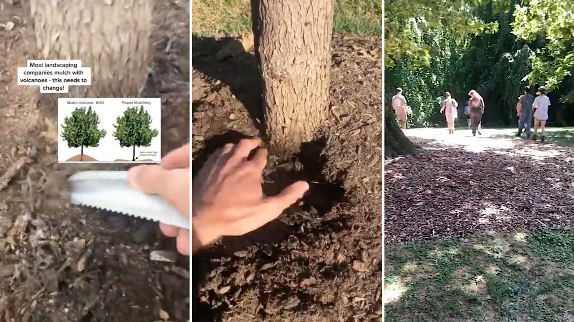 They explain that this mulch volcano "is one of the worst things you can do for your trees … because it locks moisture against the tree's trunk." In the caption, they clarified adding this can cause "rot, disease, and pests."