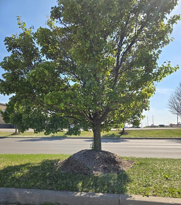 The accompanying photos show a row of trees each fitted with its own suffocating mulch volcano. Mulch volcanoes are a pervasive and popular landscaping trend in which mulch is piled up and packed tight around the base of a tree, forming a volcano-like cone. While they are ostensibly intended to protect the trunk, they actually do the opposite.