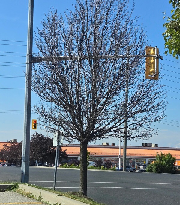 "This excellent mulching job I get to pass by when going to my local home centre," the poster wrote. "They've been like this since before I started visiting this plaza regularly 3-4 years ago. At least they're just Chanticleer pears. Gee I wonder why the one on the end died."