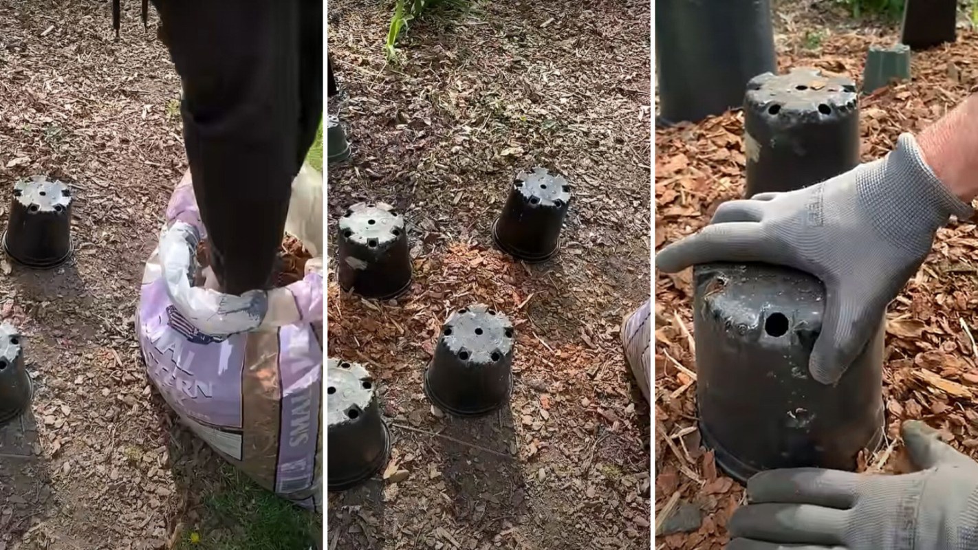 The video shares a handy trick on how to prevent this using empty plant pots, saying, "It's a great way to put that stash of nursery pots in your shed to use!"