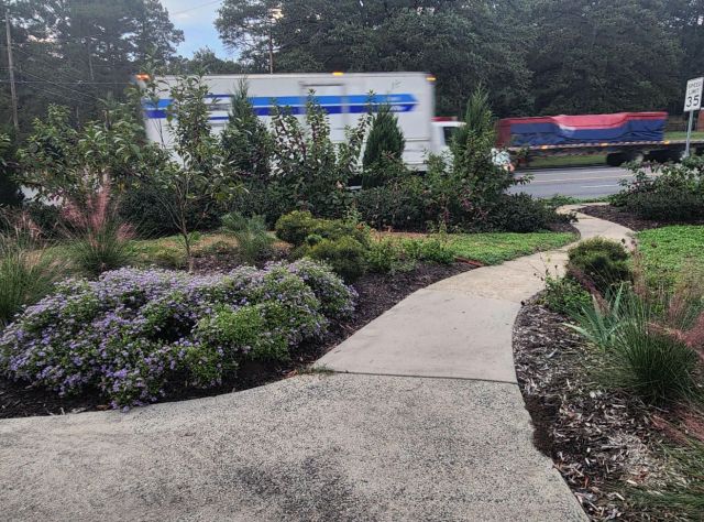 The photo shows a winding sidewalk leading toward a busy road surrounded by a lush yard lined with asters and greenery.