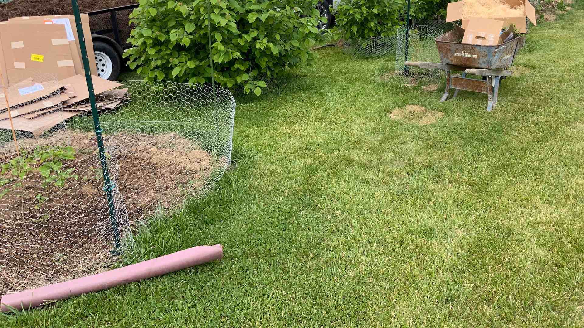 Next, the original poster started smothering the grass with cardboard and mulch, addressing one section at a time. Each time, they added trees and young plants to the newly prepared section. Some of their additions include flowering dogwood, hardhack, blueberry, sweetfern, American cranberrybush viburnum, and an assortment of flowers that are great for attracting pollinators. They surrounded the long, thin mulch bed with logs as they went and placed stepping stone paths across it.