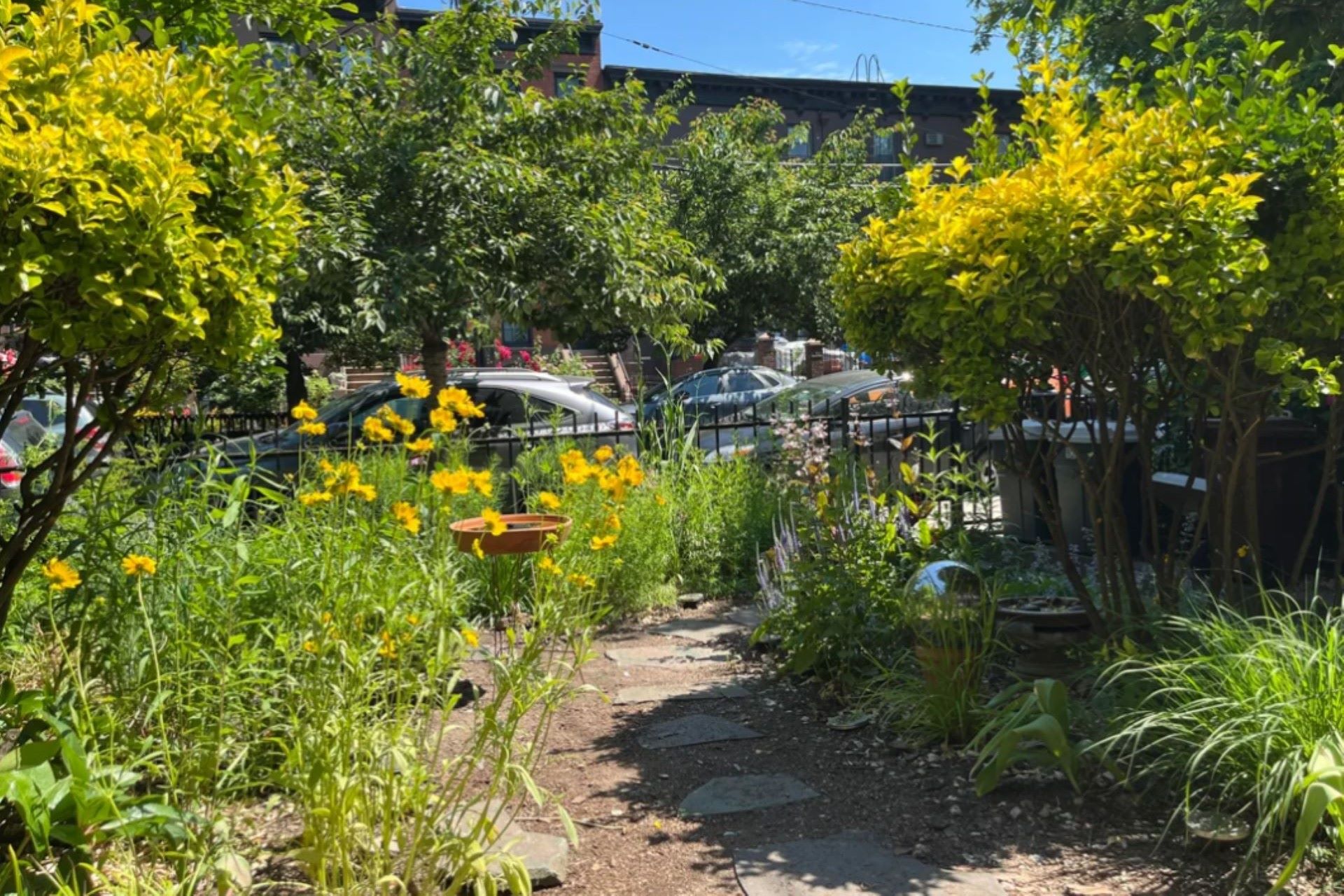 The photos on the post show a huge variety of plants, shrubs, and wildflowers, as well as a bird in a bird bath, all thriving despite the small space available. This native plant yard is a great addition to the urban setting, supporting pollinators and ensuring the local ecosystem has the resources to thrive.