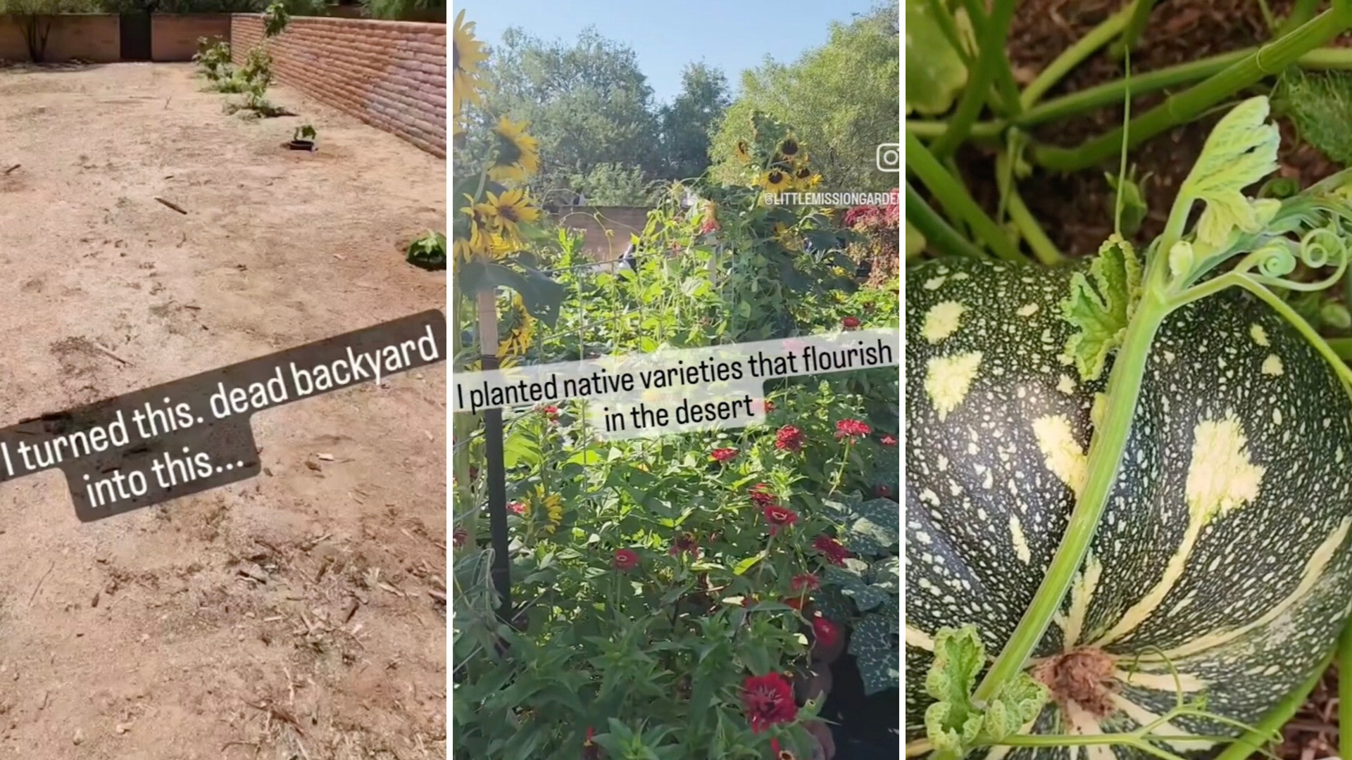 The clip opens with a desert backyard empty of life. Sow Arizona shows the yard's journey from its dusty beginnings to a vibrant garden filled with native plants, colorful flowers, and squash, adding that the change only took a year.
